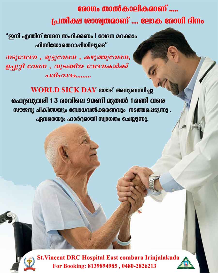 ഇരിങ്ങാലക്കുട : ലോക രോഗി ദിനത്തോട് അനുബന്ധിച്ചു ഫെബ്രുവരി 13 വെള്ളിയാഴ്ച രാവിലെ 9 മണി മുതൽ 1മണി വരെ…