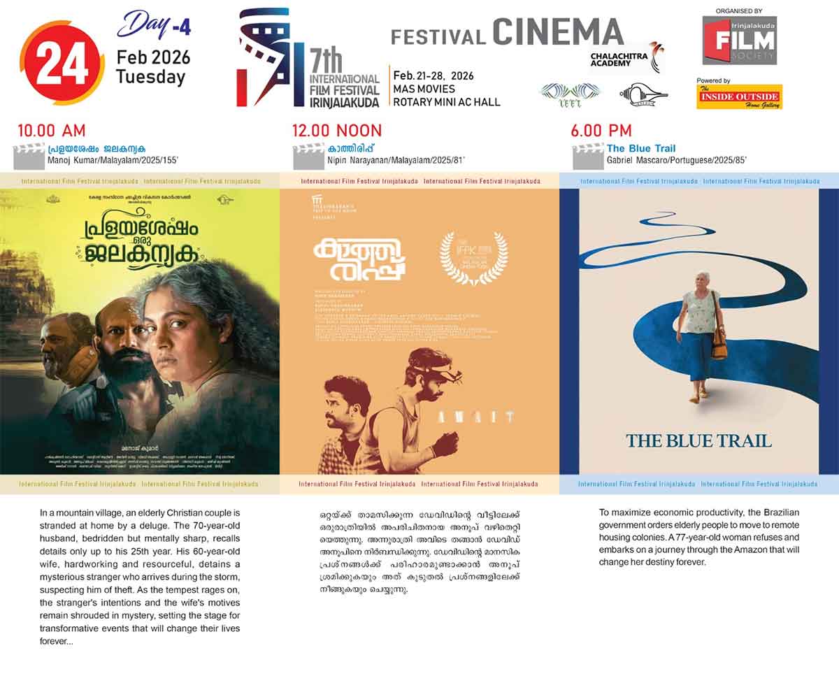 ഇരിങ്ങാലക്കുട : എഴാമത് ഇരിങ്ങാലക്കുട അന്താരാഷ്ട്ര ചലച്ചിത്രമേള അഞ്ചാം ദിനമായ ബുധനാഴ്ച (ഫെബ്രുവരി 25 ) മാസ് മൂവീസിൽ രാവിലെ…
