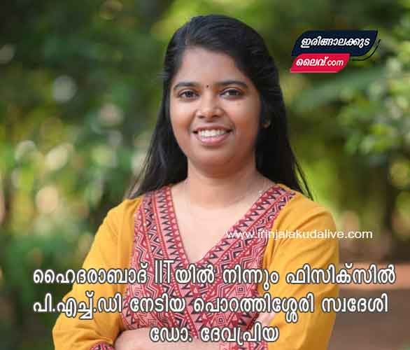 ഇരിങ്ങാലക്കുട : ഹൈദരാബാദ് ഇന്ത്യന് ഇന്സ്റ്റിറ്റ്യൂട്ട് ഓഫ് ടെക്നോളജി (IIT) യില് നിന്നും ഫിസിക്സില് പി.എച്ച്.ഡി നേടിയ ഡോ. ദേവപ്രിയ…