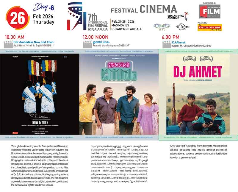 ഇരിങ്ങാലക്കുട : ഇരിങ്ങാലക്കുട അന്താരാഷ്ട്ര ചലച്ചിത്രമേളയുടെ ആറാം ദിനമായ വ്യാഴാഴ്ച ( ഫെബ്രുവരി 26 ) മാസ് മൂവീസിൽ രാവിലെ…