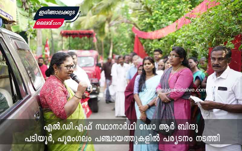 എൽ.ഡി.എഫ് സ്ഥാനാർഥി ഡോ ആർ ബിന്ദു ഇരിങ്ങാലക്കുട നഗരസഭ, പടിയൂർ, പൂമംഗലം പഞ്ചായത്തുകളിൽ പര്യടനം നടത്തി