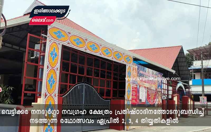 ഇരിങ്ങാലക്കുട : വെട്ടിക്കര ശ്രീ നനദുർഗ്ഗാനവഗ്രഹ ക്ഷേത്രത്തിലെ പ്രതിഷ്ഠാദിനത്തോടനുബന്ധിച്ച് നടത്തുന്ന രഥോത്സവം ഏപ്രിൽ 2, 3, 4 വ്യാഴം, വെള്ളി,…