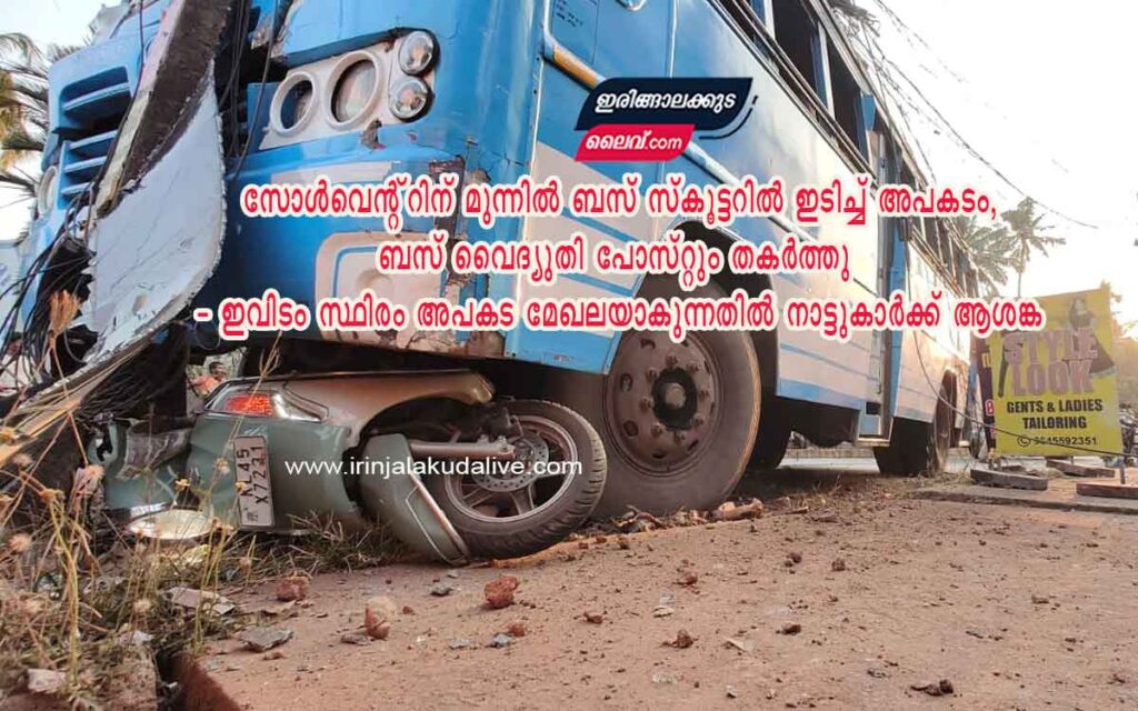 ഞായറാഴ്ച വൈകിട്ട് അഞ്ചരയോടെയായിരുന്നു അപകടം. തൃശ്ശൂരിൽ നിന്നും കൊടുങ്ങല്ലൂരിലേക്ക് പോകുകയായിരുന്നു എം എസ് മേനോൻ ബസ് മുന്നിൽ പോവുകയായിരുന്നു സ്കൂട്ടറിലും സമീപത്തെ വൈദ്യുതി പോസ്റ്റിലും ഇടിച്ചാണ് അപകടം ഉണ്ടായത്. KL 45 X 7231 സുസുകി അക്സസ്സ് സ്കൂട്ടറാണ് അപകടത്തിൽ പെട്ടത്.