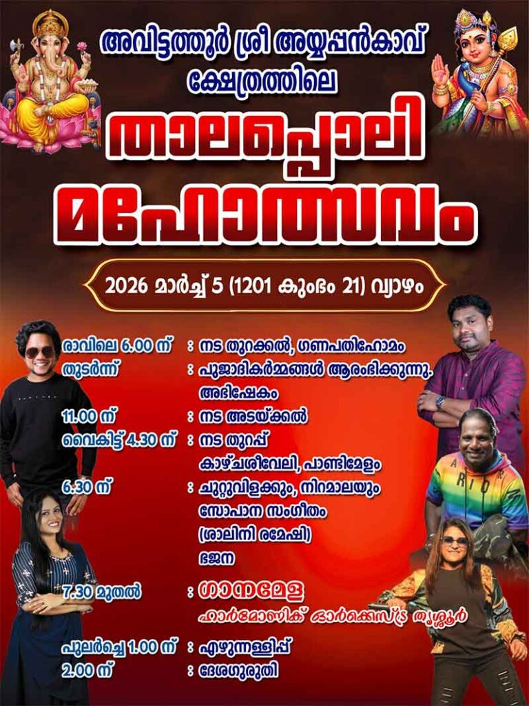 അവിട്ടത്തൂർ ശ്രീ അയ്യപ്പൻകാവ് താലപ്പൊലി മഹോത്സവം മാർച്ച്‌ 5ന്
