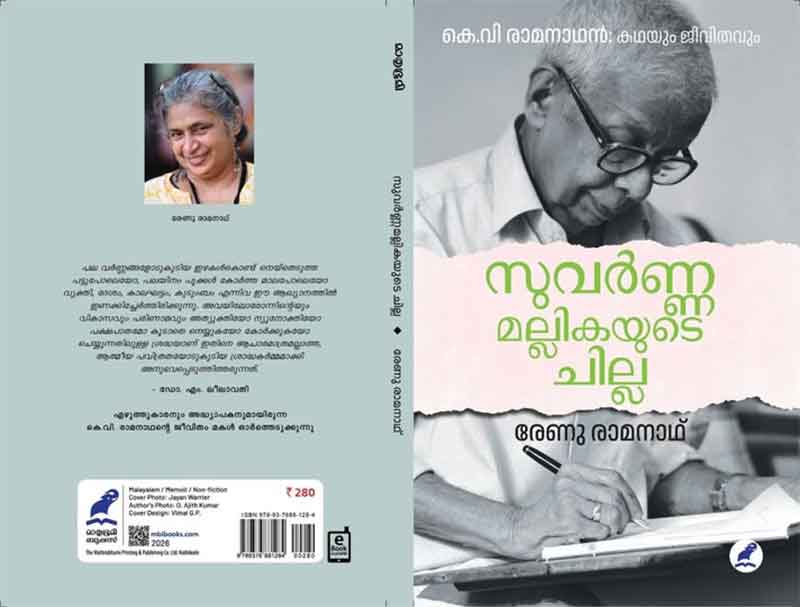 ഇരിങ്ങാലക്കുട : പ്രശസ്ത സാഹിത്യകാരനായ കെ. വി. രാമനാഥൻ്റെ ജീവിതത്തെക്കുറിച്ച് മകളും പത്രപ്രവർത്തകയുമായ രേണു രാമനാഥ് രചിച്ച ‘സുവർണ്ണമല്ലികയുടെ ചില്ല കെ. വി. രാമനാഥൻ: കഥയും ജീവിതവും’ എന്ന പുസ്തകം മാതൃഭൂമി ബുക്സ് പ്രസിദ്ധീകരിക്കുകയാണ്. അച്ഛൻ പറഞ്ഞ കഥകൾ കേട്ടു വളർന്ന ഒരു മകൾ, അച്ഛൻ്റെ ഓർമ്മകളിലൂടെ അച്ഛൻ വളർന്ന നാടിൻ്റെയും ജീവിച്ച കാലത്തിൻ്റെയും കഥ പറയുകയാണിതിൽ.