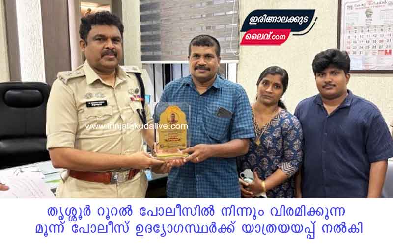 ഇരിങ്ങാലക്കുട : സുദീർഘവും സ്തുത്യർഹവുമായ സേവനത്തിന് ശേഷം മാർച്ച് 31-ന് സർവീസിൽ നിന്ന് വിരമിക്കുന്ന മൂന്ന് പോലീസ് ഉദ്യോഗസ്ഥർക്ക് തൃശ്ശൂർ റൂറൽ പോലീസ് യാത്രയയപ്പ് നൽകി. ചാലക്കുടി പോലീസ് സ്റ്റേഷനിലെ എസ്.ഐ. ഇ.ആർ. സിജുമോൻ, പെരിങ്ങോട്ടുകര എയ്ഡ് പോസ്റ്റിലെ ജി.എസ്.ഐ. കെ. സജീവ്, ജില്ലാ പോലീസ് ഹെഡ്ക്വാർട്ടേഴ്സിലെ ജി.എസ്.ഐ. എൻ.എസ്. സാജൻ എന്നിവർക്കാണ് ഇരിങ്ങാലക്കുടയിലെ ജില്ലാ പോലീസ് മേധാവിയുടെ ഓഫീസിൽ വെച്ച് യാത്രയയപ്പ് നൽകിയത്.