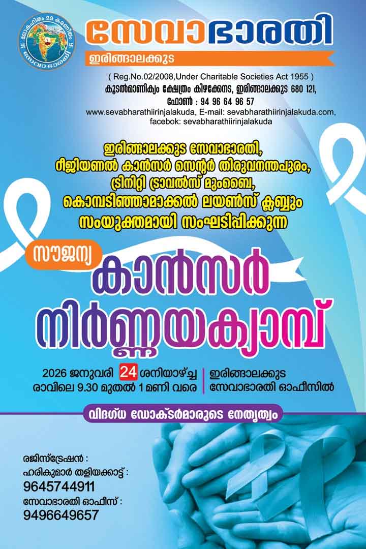 ഇരിങ്ങാലക്കുട : ഇരിങ്ങാലക്കുട സേവാഭാരതി, റീജിയണൽ കാൻസർ സെൻ്റർ തിരുവനന്തപുരം, ട്രിനിറ്റി ട്രാവൽസ് മുംബൈ, കൊമ്പടിഞ്ഞാമാക്കൽ ലയൺസ് ക്ലബ്ബും സംയുക്തമായി സംഘടിപ്പിക്കുന്ന സൗജന്യ കാൻസർ നിർണ്ണയ ക്യാമ്പ് 2026 ജനുവരി 24 ശനിയാഴ്ച്ച കൂടൽമാണിക്യം ക്ഷേത്രം കിഴക്കേനടയിലുള്ള ഇരിങ്ങാലക്കുട സേവാഭാരതി ഓഫീസിൽ രാവിലെ 9.30 മുതൽ 1 മണി വരെ വിദഗ്ധ ഡോക്ടർമാരുടെ നേതൃത്വ ത്തിൽ സംഘടിപ്പിക്കുന്നു. രജിസ്ട്രേഷനു ബന്ധപെടുക 9645744911 ഹരികുമാർ തളിയക്കാട്ട്, 9496649657 സേവാഭാരതി ഓഫീസ്.