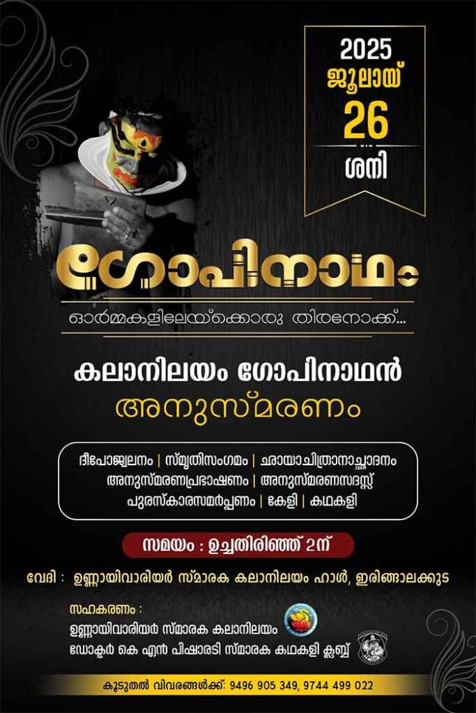 ഇരിങ്ങാലക്കുട : കഥകളി നടനും ഉണ്ണായി വാര്യർ സ്മാരക കലാനിലയത്തിലെ മുഖ്യ വേഷം അധ്യാപകനും ആയിരുന്ന കലാനിലയം ഗോപിനാഥൻ വിടപറഞ്ഞിട്ട് രണ്ടുവർഷം പിന്നിടുന്ന അവസരത്തിൽ അദ്ദേഹത്തിൻ്റെ സ്മരണയിൽ ശിഷ്യർ ഒത്തുചേർന്ന് “ഗോപിനാഥം – ഓർമകളിലേയ്ക്കൊരു തിരനോക്ക്” എന്ന പരിപാടി സംഘടിപ്പിക്കുന്നു.