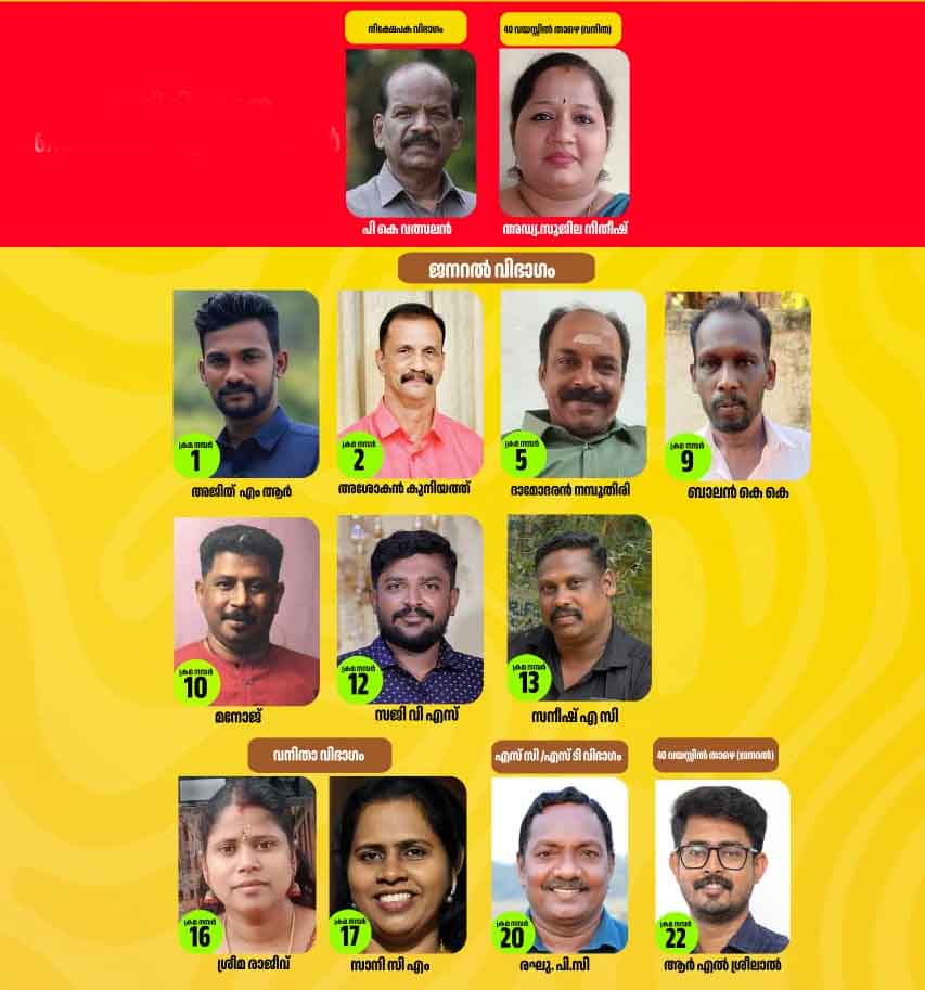 ജനറൽ വിഭാഗത്തിൽ അജിത്ത് എംആർ, അശോകൻ കുനിയത്ത്, ദാമോദരൻ നമ്പൂതിരി, ബാലൻ കെ കെ, മനോജ്, സജീവി.എസ്, സനീഷ് എസി. വനിതാ വിഭാഗത്തിൽ ശ്രീമ രാജീവ്, സാനി സിഎം, എസ് സി എസ് ടി വി വിഭാഗം രഘു പി സി, 40 വയസ്സിൽ താഴെ ജനറൽ വിഭാഗം ആർ എൽ ശ്രീലാൽ, നിക്ഷേപ വിഭാഗം പി കെ വത്സലൻ, 40 വയസ്സിൽ താഴെ (വനിത )അഡ്വ. നിതീഷ്