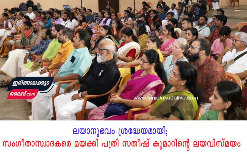 ഇരിങ്ങാലക്കുട : വരവീണ സ്കൂൾ ഓഫ് മ്യൂസിക്കിന്റെ ആഭിമുഖ്യത്തിൽ മുനിസിപ്പൽ ടൗൺ ഹാളിൽ നടന്ന “ലയാനുഭവം” സംഗീതപരിപാടി മികച്ച പങ്കാളിത്തത്തോടെയും കലാസൗന്ദര്യത്തോടെയും സമാപിച്ചു. പ്രശസ്ത മൃദംഗ ചക്രവർത്തി പത്രി സതിഷ് കുമാർ നയിച്ച ഇന്ററാക്ടീവ് സെഷനായിരുന്നു പരിപാടിയുടെ പ്രധാന ആകർഷണം.