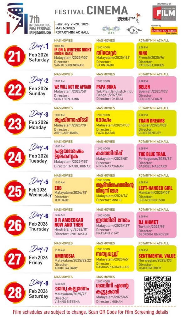 2026 ഫെബ്രുവരി 21 മുതൽ 28 വരെ ഇരിങ്ങാലക്കുട മാസ് മൂവീസിലും റോട്ടറി ക്ലബ് ഹാളിലുമായി നടക്കുന്ന ഏഴാമത് ഇരിങ്ങാലക്കുട അന്തർദേശീയ ചലച്ചിത്രമേളയുടെ സ്ക്രീനിംഗ് വിവരങ്ങൾ